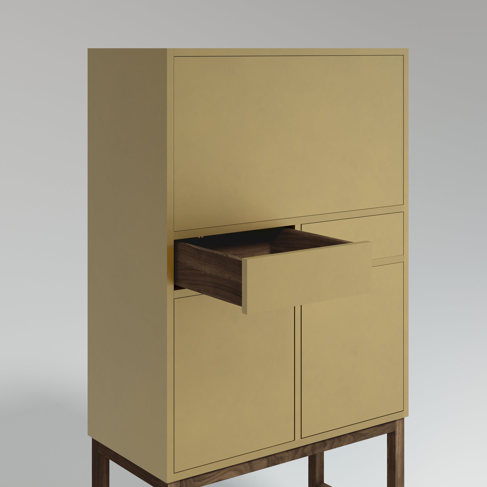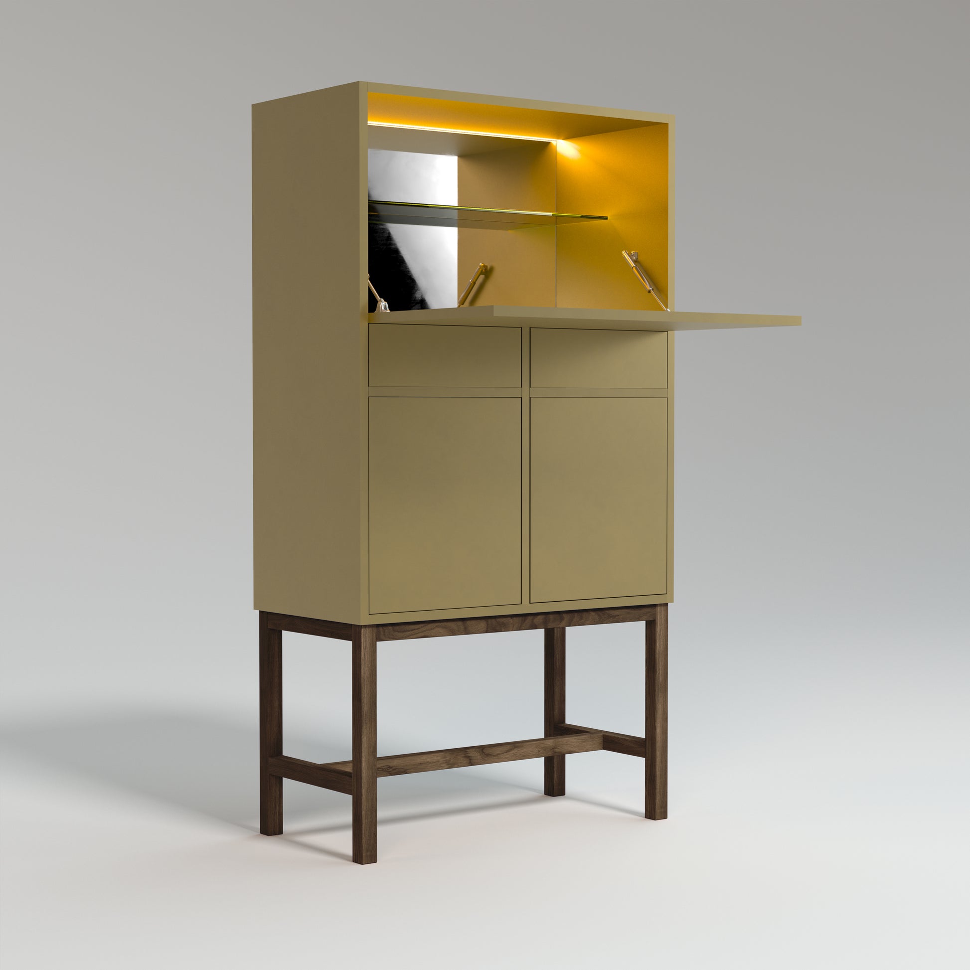 The interior is thoughtfully designed to welcome guests with warm dimmable LED lighting, mirrored glass and glass shelf and a lacquered work surface. Push-open drawers — perfect for storing coasters and smaller drinking essentials — give the cabinet a clean, handle-free look. Two larger drawers feature oak veneer shelves that can be mounted at varying heights, offering plenty of room for your favorite glasses and bottles.